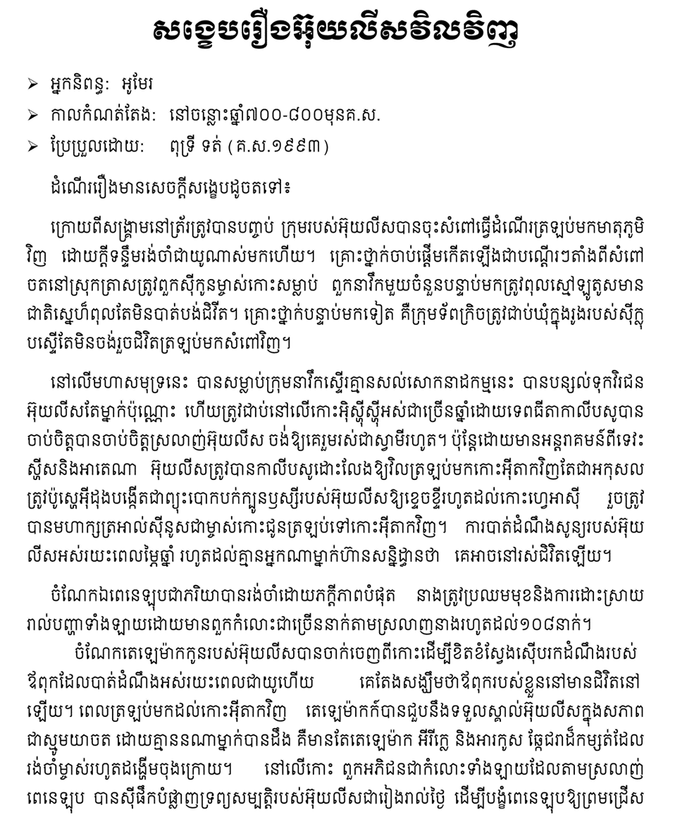 - ដកស្រង់រឿងអ៊ុយលីសវិលវិញ- អ្នកនិពន្ធដោយ លោក អូ មែរ- កាលកំណត់តែងចន្លោះ ឆ្នាំ៧០០-៨០០ មុនគ.ស.- ប្រែសម្រួលដោយ៖ ពុទ្រី ទត់(គ.ស.១៩៩៣)- ប្រភេទរឿង៖ ទេវកថា- ប្រភព៖ ប្រទេសក្រិក។