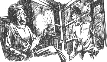រាត្រីនោះ នាឡិកាបន្លឺម៉ោងប្រាំបួន។ ខាងក្រៅផ្ទះ មេឃងងឹតចាក់ភ្នែកមិនធ្លុះ ភ្លៀងបង្អុរមិនឈប់ ខ្យល់បក់បោកយ៉ាងខ្លាំង។ ដូនចាស់ មិនទាន់សម្រាន្តនៅឡើយ គាត់អង្គុយចាក់ឫសក្នុងកៅអីបង្អែកមួយ ក្នុងបន្ទប់ដែលស្ថិតនៅជាប់នឹងសួនបន្លែ។ បន្ទប់នេះ មានសុទ្ធតែតុ ទូចាស់ៗ ដាក់រាយពាសពេញ។ ដូនចាស់កើតក្តីព្រួយបារម្ភពន់ពេកចំពោះចៅប្រុស ដែលមិនទាន់ត្រឡប់មកពីដើរលេងវិញ។ ស្នូរនីមួយៗតែងធ្វើឱ្យគាត់ចាប់អារម្មណ៍ហើយផ្ទៀងត្រចៀកស្តាប់ ស្រាប់តែ៖ តុក! តុក! ស្នូរគោះទារ លាន់ឮឡើង។ ច្បាស់ជាអាសុខ មកពីដើរលេងហើយ ដូនចាស់នឹកក្នុងចិត្ត។ ពិតជាសុខ មកពីដើរលេងហើយ ដូនចាស់នឹកក្នុងចិត្ត។ សក់ក្បាលខ្ញីវខ្ញូវដូចកណ្តុរលង់ទឹក។ ថ្ញាសវាឡើងហើម។ វាឈ្លោះជាមួយគេ ត្រូវគេវាយជាដំណំ។ មួកវាត្រូវប៉ើងធ្លាក់ទៅក្នុងរណ្តៅ មិនតែប៉ុននោះ វាថែមទាំងលេងល្បែងចាញ់អស់ប្រាក់ គ្មានសល់លុយកាក់។ ដោយអាណិតស្រឡាញ់ចៅខ្លាំងពេក ដូនចាស់យុះខ្សឹកខ្សួល តំណក់ទឹកភ្នែកហូរកាត់ផែនថ្ពាល់ដ៏ជ្រីវជ្រួញរបស់គាត់។ គាត់ត្អូញ៖ ចៅអើយ! ចៅមិនស្រឡាញ់យាយតិចតួចឡើយ។ បើមិនអ៊ីចឹង ហេតុអ្វីបានជាចៅឆ្លៀតឱកាសឪពុកម្តាយមិននៅ ដើរលេងប៉ោឡែទុកឱ្យយាយនៅផ្ទះម្នាក់ឯងយ៉ាងនេះ? អីក៏ដាច់ចិត្តម៉្លេះចៅមិនអាណិតយាយទេឬ?