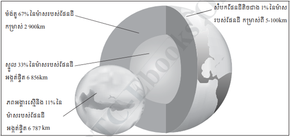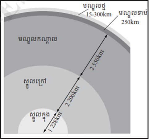 ម៉ង់តូជាស្រទាប់ស្ថិតនៅចន្លោះសំបក និង ស្នូល។ វាមានម៉ាស 67% នៃម៉ាសផែនដី និងកម្រាស់ 2 900 Km ។ ស្នូលផែនដី ជាស្រទាប់ក្នុងគេបង្អស់លាតសន្ធឹងពីក្រោមម៉ង់តូទៅដល់ផ្ចិតផែនដី។ ស្នូលផែនដីចែកចេញជាពីរប្រភេទគឺ ស្នូលក្រៅជាស្រទាប់រាវស្ថិតនៅក្រោមម៉ង់តូមានកម្រាស់ប្រហែល 2 200 km ។ ស្នូលក្នុងរឹងហើយធ្ងន់ស្ថិតនៅចំកណ្តាលភពមានកម្រាស់ប្រហែល 1 228 km ។