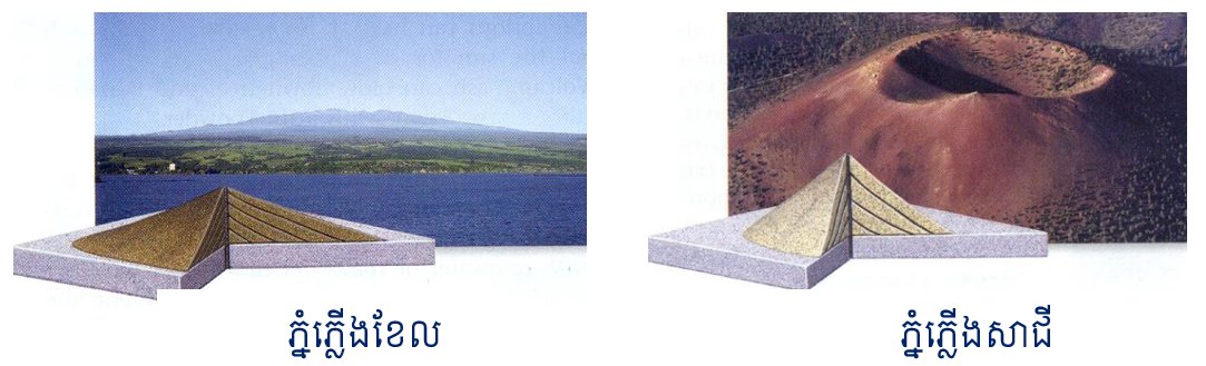 • ភ្នំភ្លើងខែល កើតពីស្រទាប់កំអែភ្នំភ្លើងដែលហូរគលើគ្នាបន្តបន្ទាប់នៃបន្ទុះស្ងប់ កំអែមានលក្ខណៈរាវខ្លាំងធ្វើឱ្យរាលដាលគ្របដណ្តប់លើផ្ទៃធំ។