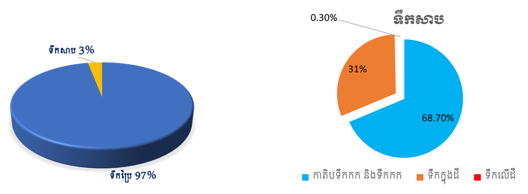ភាគច្រើននៃទឹកនៅលើភពផែនដីជាទឹកប្រៃដែលស្ថិតនៅក្នុងមហាសមុទ្រ ដែលមានប្រហែល 97% ហើយមានតែ 3% ប៉ុណ្ណោះដែលជាទឹកសាប។ ក្នុងចំណោម 3% គឺមានប្រហែល 3 ភាគ 4 ជាផ្ទាំងទឹកកកដែលស្ថិតនៅប៉ូលទាំងពីរ ស្ទើតែ 1 ភាគ 4 ជាទឹកសាបក្នុងដី។