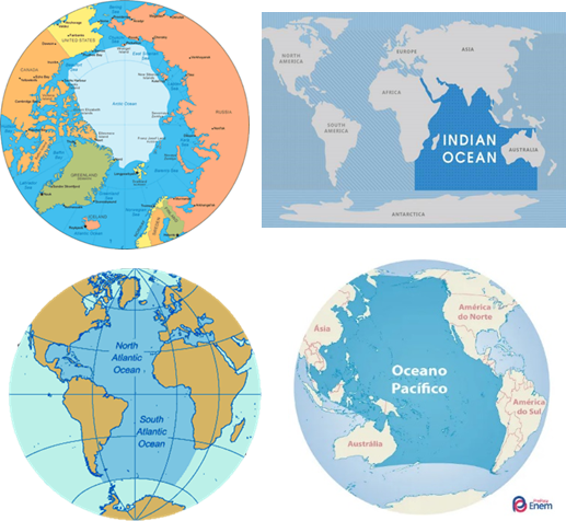 របាយ និងរាងរបស់ទ្វីប ប្រជុំកោះ និងលក្ខខណ្ឌមួយចំនួនទៀតបានកំណត់ឱ្យគេធ្វើការបែងចែកមហាសមុទ្រជា 4 ធំៗ និងសមុទ្រតូចៗផ្សេងទៀត។ មហាសមុទ្រអាកតិចជាមហាសមុទ្រតូចជាងគេ ហើយរាក់ជាងគេបំផុត។ ភាគច្រើននៃផ្ទៃរបស់វាគឺគ្របដណ្តប់ដោយទឹកកក។ មហាសមុទ្រឥណ្ឌា ជាមហាសមុទ្រធំទីបីគ្របដណ្តប់ប្រហែល 20% នៃផ្ទៃទឹកលើភពផែនដី។ វាមានព្រំដែនខាងជើងជាប់ជាមួយទ្វីបអាស៊ី ខាងលិចជាប់ទ្វីបអាហ្វ្រិក ខាងកើតជាប់នឹងឧបទ្វីបឥណ្ឌូចិន និងប្រជុំកោះស៊ុនដា ហើយខាងត្បូងជាប់ទ្វីបអង់តាកទិច និងអូស្រ្តាលី។ មហាសមុទ្រអាត្លង់ទិច ទំហំមហាសមុទ្រអាត្លង់តិចមានប្រហែលពាក់កណ្តាលមហាសមុទ្រប៉ាស៊ីហ្វិក វាជាមហាសមុទ្រធំលំដាប់ទីពីរ គ្របដណ្តប់ប្រហែល 1 ភាគ 5 នៃផ្ទៃផែនដី។ មហាសមុទ្រប៉ាស៊ីហ្វិច ជាមហាសមុទ្រធំជាងគេបំផុត មានផ្ទៃធំទូលាយ លាតសន្ធឹងពីមហាសមុទ្រអាកទិចនៅផ្នែកខាងជើង ហើយឆ្ពោះទៅទ្វីបអង់តាកទិចនៅផ្នែកខាងត្បូង មានព្រំដែនជាប់ជាមួយទ្វីបអាស៊ី នឹងអូស្រ្តាលី ហើយផ្នែកខាងលិចជាប់នឹងទ្វីបអាមេរិក។
