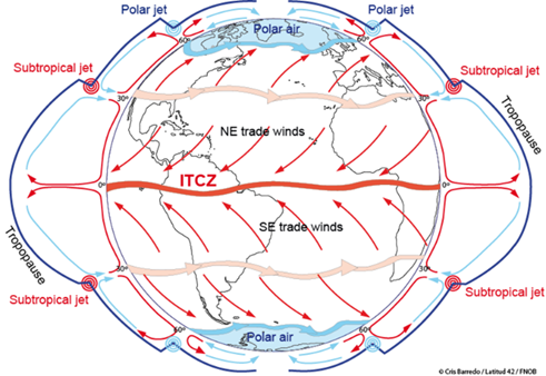 ICTZ ជះឥទ្ធិពលទៅលើបណ្តាប្រទេសអេក្វាទ័រដូចជា មានភ្លៀងធ្លាក់ច្រើនដែលធ្វើឲ្យរដូវវស្សា និងរដូវប្រាំង។ នៅតំបន់ត្រូពិចត្រជាក់ជាងរដូវវស្សា និងរដូវប្រាំងនៅបណ្តាប្រទេសដែលមានរយៈទទឹងខ្ពស់។ ប្រព័ន្ធសម្ពាធពាក់កណ្តាលអចិន្រ្តៃយ៍នៅអឌ្ឍគោលខាងជើងមានបួនគឺ ប្រព័ន្ធសម្ពាធទាបពាក់កណ្តាលអចិន្រ្តៃយ៍ប៊ែរមុយដា និងប៉ាស៊ីភិច។ ប្រព័ន្ធសម្ពាធខ្ពស់ពាក់កណ្តាលអចិន្រ្តៃយ៍គ្រីនលែន និងអាលូស៊ាន។