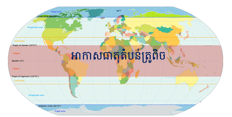 តំបន់អាកាសធាតុធំៗមានបីគឺ អាកាសធាតុតំបន់ប៉ូល តំបន់ត្រូពិច និងតំបន់ត្រជាក់បង្គួរ។