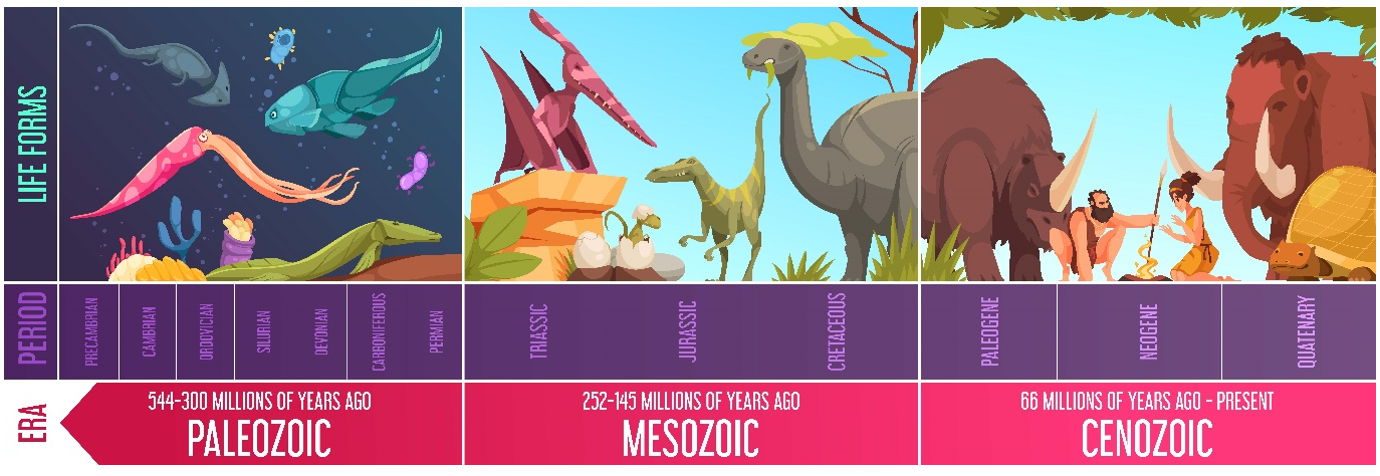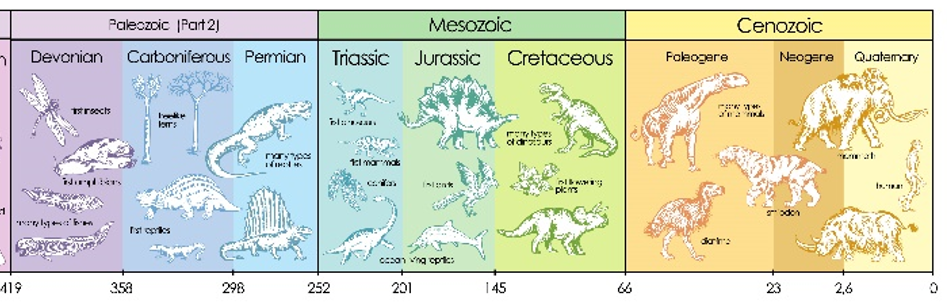 ស័កប៉ាលេអូសូអ៊ិចមាន ៦ កាលសម័យគឺ កំប្រ៊ីយាង អរដូវីស្យ៊ាង ស៊ីឡូរ្យាង ដេវ៉ូញាង កាបូនីផែ និងពែមីញាង។នៅកាលសម័យកំប្រ៊ីយាង នៅក្នុងសមុទ្រសម្បូរដោយសត្វ និងរុក្ខជាតិរស់នៅ។ រហូតមកដល់ចុងកាលសម័យ គេឃើញមានការវិវត្តនៃប្រភេទសត្វឆ្អឹងកងដែលនេះជាយុគដំបូងនៃប្រភេទត្រីដែលហៅថា ”ស័កអាយុត្រី” ។