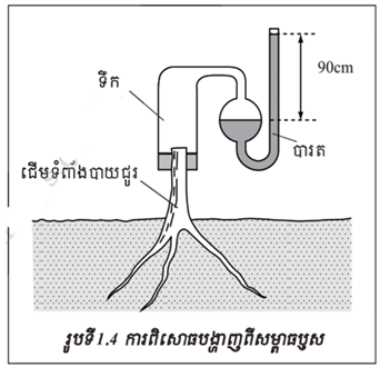 ទឹកក្នុងដីចូលតាមរោមជញ្ជក់ ហើយឆ្លងកាត់កោសិកាប៉ារ៉ង់ស៊ីមរហូតដល់អង់ដូឌែមដោយអូស្មូស។ ទឹកធ្វើដំណើរពីអង់ដូឌែមទៅរហូតទៅដល់ស៊ីឡែមដោយកម្លាំងដំណឹកនាំសកម្ម។ កម្ពស់បារតឡើងនៅផ្នែកម្ខាងនៃបំពង់ U មកពីទឹកមានសម្ពាធរុញច្រានបារត ហើយទឹកក៏បានរងសម្ពាធបញ្ចេញដោយឫសនៃទំពាំងបាយជូរ។