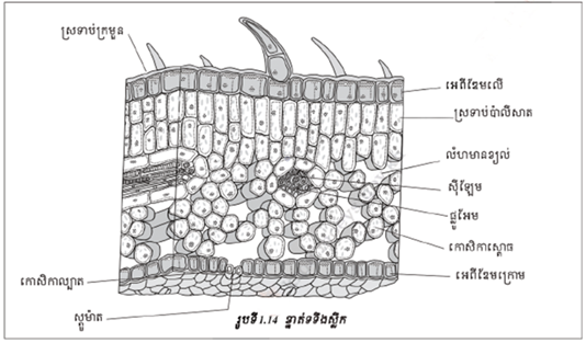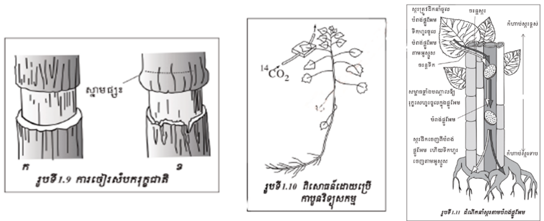 ដើម្បីសំយោគសារធាតុសរីរាង្គ កោសិកាស្លឹកមានក្លរ៉ូភីល ត្រូវការឧស្ម័នកាបូនិច និងទឹក ហើយបញ្ចេញឧស្ម័នអុកស៊ីសែនទៅក្រៅ។ បណ្ដូរឧស្ម័នកើតឡើងរវាងកោសិកាស្លឹកមានក្លរ៉ូភីលនិងលំហមានខ្យល់ក្នុងស្លឹក។ បណ្ដូរឧស្ម័នរវាងលំហមានខ្យល់នៃស្លឹកនិងបរិយាកាស ប្រព្រឹត្តទៅតាមស្ដូម៉ាត។ ការលូតលាស់តាមបណ្ដោយនៃឫសរុក្ខជាតិប្រព្រឹត្តទៅដោយសារមេជាលិកាដែលនៅខាងចុងឫស។ មេជាលិកាធ្វើចំណែកបង្កើតកោសិកាតូចៗជាច្រើនកោសិកាខ្លះធ្វើឯកទេសកម្មបំលែងជាទម្រង់ផ្សេងៗនៃឫស (ជាលិកាសរសៃនាំ កោសិការោមជញ្ជក់...) ។កោសិកាខ្លះមិនធ្វើឯកទេសកម្មទេ ហើយនៅតែបន្ដធ្វើចំណែកមីតូសទៀត។
