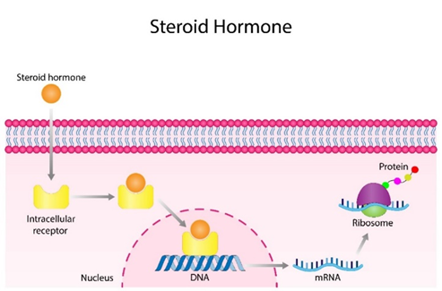 អរម៉ូនស្តេរ៉ូអ៊ីត មានអរម៉ូនដែលផលិតឡើងដោយក្រពេញលើតម្រងនោម អូវែ ពងស្វាស។ វាជាអរម៉ូនរលាយក្នុងលីពីត ដូចនេះ វាអាចឆ្លងកាត់ភ្នាសកោសិកាបានយ៉ាងងាយ។ អរម៉ូនស្តេរ៉ូអ៊ីតមានឥទ្ធិពលលើដំណើររបស់កោសិកាគោលដៅ។ សែនឯកទេស មួយក្នុងកោសិកាគោលដៅត្រូវបានភ្ញោចឱ្យសកម្មឡើង ដើម្បីសំយោគ