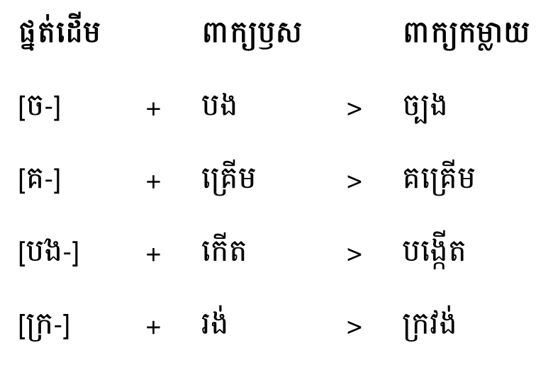 + ការបង្កើតពាក្យ៖ ក្នុងការបង្កើតពាក្យខ្មែរយើងមានវិធីបង្កើតពាក្យច្រើនយ៉ាង វិធីគន្លាស់កាត់ វិធីរណ្ដំបរិវាសព្ទ វិធីកម្ចី វិធីបន្សំ វិធីកម្លាយ (ផ្នត់ដើម និងផ្នត់ជែក) ជាដើម...។