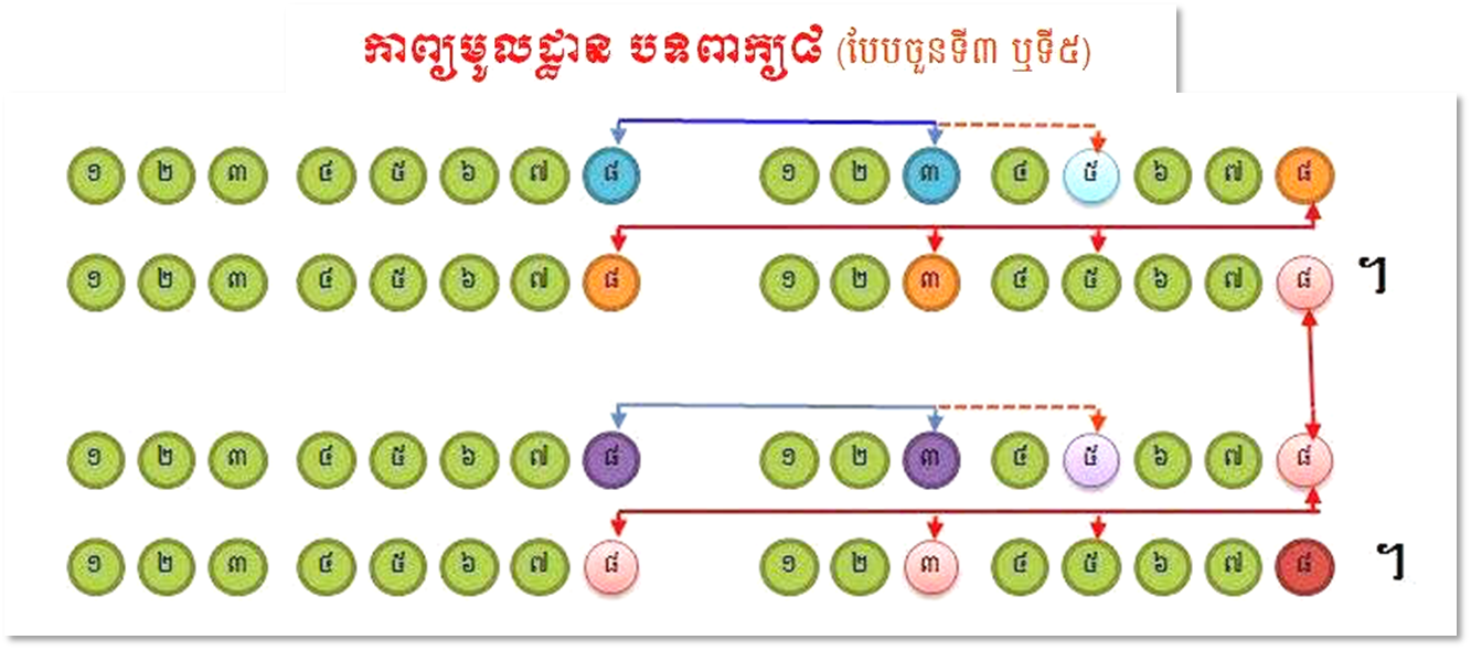 (បទពាក្យ៨ មានចំណាប់ចួនរហូតដល់ទៅ៣បែប តែនេះខ្ញុំសូមលើកតែចំណាប់ចួនព្យាង្គ ៣ និង៥ មកបង្ហាញប៉ុណ្ណោះ)
