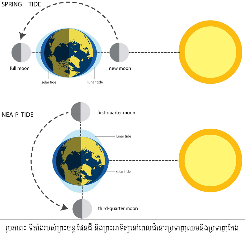ជំនោរសមុទ្រកើតឡើងនៅពេលព្រះចន្ទព្រះអាទិត្យនិងផែនដីស្ថិតនៅលើបន្ទាត់តែមួយជាមួយគ្នាដែលផែនដី
