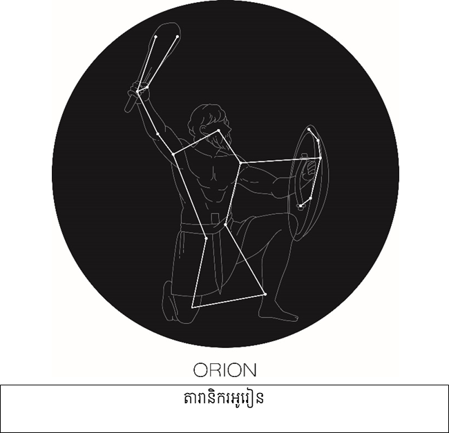 + តារានិករអូរៀន (Orion) បង្ហាញថាតារារីហ្គែលស្ថិតនៅកែងជើងប្រមាញ់។