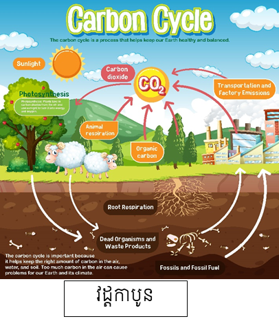 + វដ្ដកាបូន ជាចលនានៃកាបូននៅក្នុងទម្រង់ឬរូបរាង ផ្សេងៗនៅក្នុងមណ្ឌលជីវៈ បរិយាកាស មហាសមុទ្រ