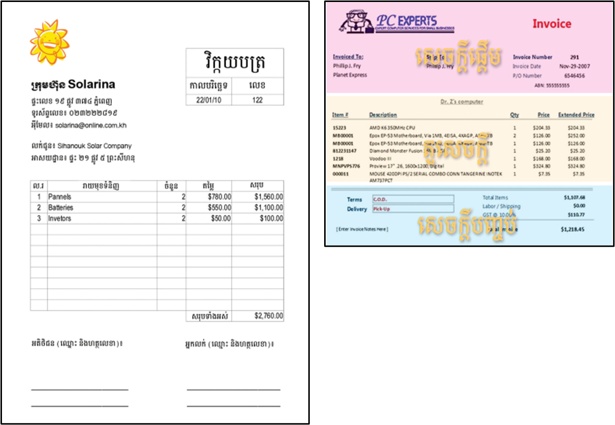 ◊ វិក្កយបត្រ ជាឯកសារដែលឆ្លុះបញ្ចាំងពីកិច្ចព្រមព្រៀងរវាងអ្នកលក់ និងអ្នកទិញលើទំនិញ និងសេវាកម្មដែលអតិថិជនយល់ព្រមទិញនិងបង់ប្រាក់ទៅតាមតម្លៃដែលអ្នកទិញ និងអ្នកលក់បានយល់ព្រមទាំងសងខាង។