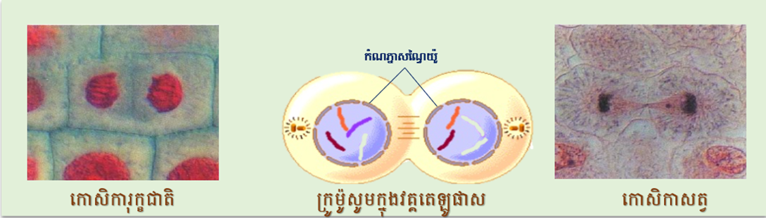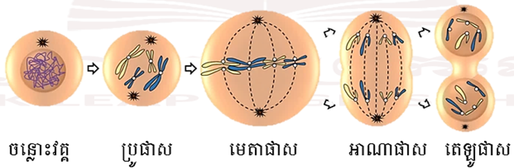 • មីតូសគឺជាលំនាំមួយដែលណ្វៃយ៉ូកោសិកាមួយត្រូវបានចែកខ្លួនជាណ្វៃយ៉ូកូនពីរ ហើយណ្វៃយ៉ូនីមួយៗមានចំនួននិងរូបរាងក្រូម៉ូសូមដូចណ្វៃយ៉ូក្នុងកោសិកាមេ។