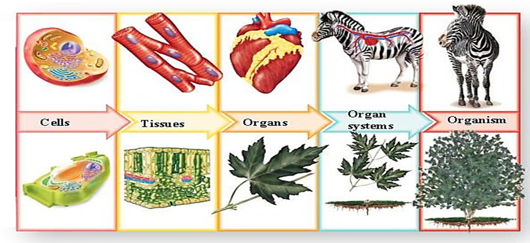 ឧទាហរណ៍៖ កោសិកាសាច់ដុំមានឯកទេសក្នុងការធ្វើចលនាកោសិកាក្រពេញទឹកមាត់បង្កើតអង់ស៊ីមអាមីឡាសក្នុងទឹកមាត់។ តើរូបផ្គុំរបស់សារពាង្គកាយមានប៉ុន្មានកម្រិត? អ្វីខ្លះ?