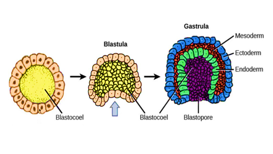 កោសិកានៃស្រទាប់ខាងក្រៅ រុញឆ្ពោះទៅក្នុងបង្កើតបានជា កោសិកាស្រទាប់ទីបី គឺមេសូឌែម។ មានការបំលែងឯកទេស៖