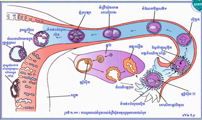 • ស្ពៃម៉ាតូសូអ៊ីតធ្វើដំណើរតាមបណ្តោយបំពង់អូវុលរហូត បានជួបនឹងអូវុលហើយធ្វើការបង្កកំណើត។