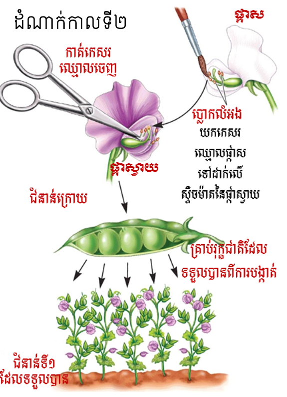 • ដំណាក់កាលទី២៖ ធ្វើការបង្កកំណើតនិម្មិត (បង្កាត់ប្រភេទផ្កា ២ផ្សេងគ្នា) ដោយបង្កាត់សណ្ដែកព័រពូជសុទ្ធពីរដែលមានលក្ខណៈខុសគ្នាតែម្យ៉ាង (សណ្ដែកព័រ ផ្កាស និងផ្កាស្វាយ) ។ បន្ទាប់ពីទទួលបានលទ្ធផល គាត់យកគ្រាប់នោះទៅដាំរងចាំសង្កេតលទ្ធផល។ លទ្ធផលដែលទទួលបានគឺផ្កាពណ៌ស្វាយទាំងអស់។ កូនជំនាន់ក្រោយនេះគឺជាអ៊ីប្រ៊ីត (អ៊ីប្រីតជំនាន់ទី១ F1) ។