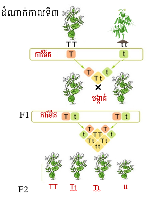 • ដំណាក់កាលទី៣៖ ម៉ងដែលយកគ្រាប់ដែលទទួលបាន F1 ទៅដាំ រួចទុកឱ្យស្វ័យបង្កកំណើត (F1 × F1) ទទួលបាន F2 ។