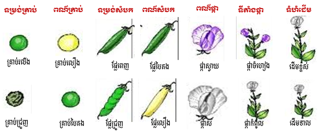 បង្កាត់សណ្ដែកព័រពូជសុទ្ធពីរដែលមានលក្ខណៈខុសគ្នាតែម្យ៉ាងគឺទិដ្ឋភាពគ្រាប់ដែលមានទិដ្ឋភាពពីរគឺ គ្រាប់ពណ៌លឿង និងគ្រាប់ពណ៌បៃតង។