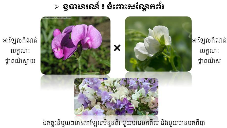 ឧទាហរណ៍ ៖ ចំពោះលក្ខណៈពណ៌ផ្កាសណ្តែកមានទិដ្ឋភាពពីរគឺផ្កាពណ៌ស្វាយនិងផ្កាពណ៌ស។ ដូចនេះសែនកំណត់លក្ខណៈពណ៌ផ្កាមានអាឡែលពីរគឺអាឡែលកំណត់លក្ខណៈផ្កាពណ៌ស្វាយ និងអាឡែលកំណត់លក្ខណៈផ្កាពណ៌ស។
