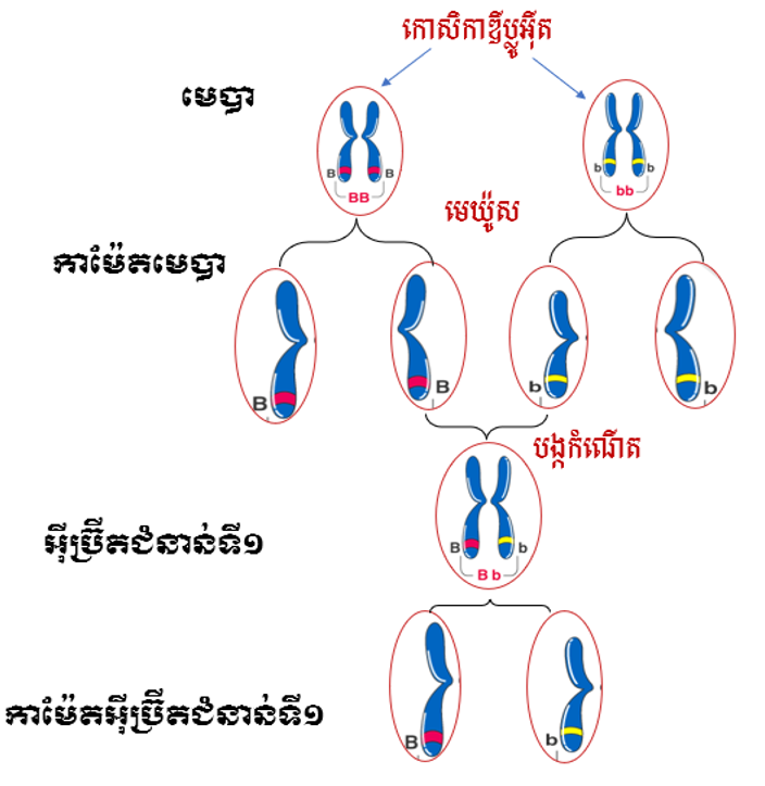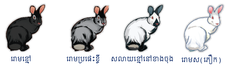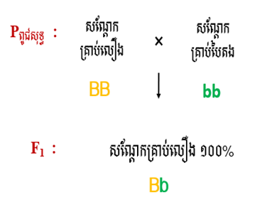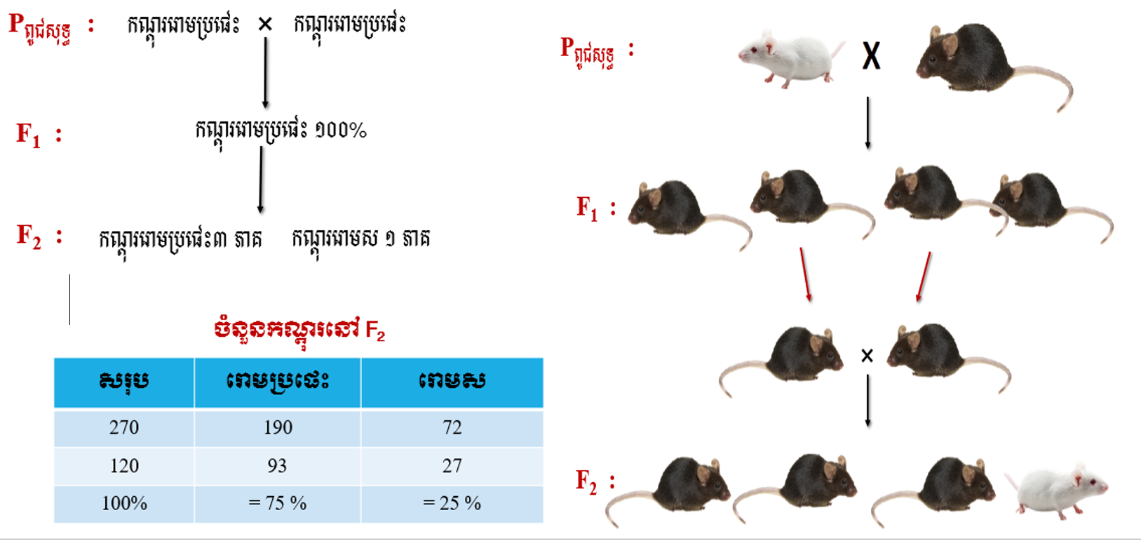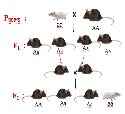 យើងសិក្សាអំពីការបញ្ជូនលក្ខណៈពណ៌របស់រោមកណ្ដុរ។ ទិដ្ឋភាពពីរ ៖ រោមពណ៌ប្រផេះ និង រោមពណ៌ស។ បង្កាត់លើមេបាពូជសុទ្ធ ដើម្បីបានឯកត្តៈពូជសុទ្ធចំពោះលក្ខណៈមួយ។ ឧ.កណ្ដុររោមប្រផេះពូជសុទ្ធ។