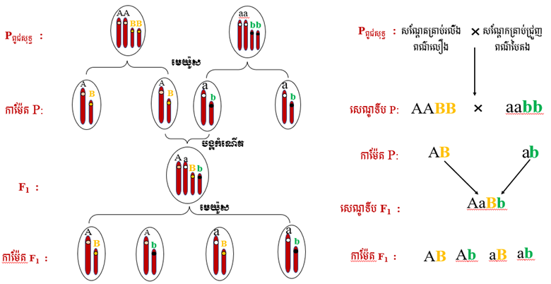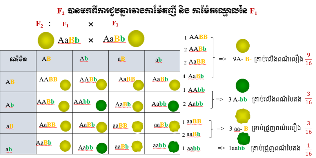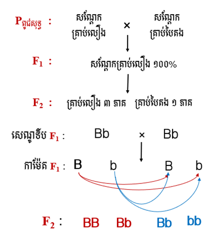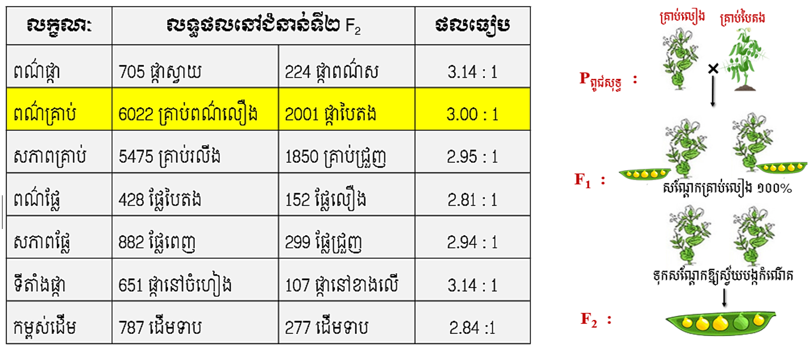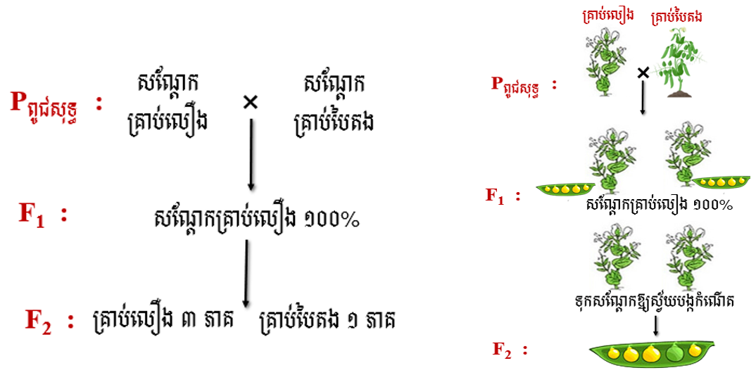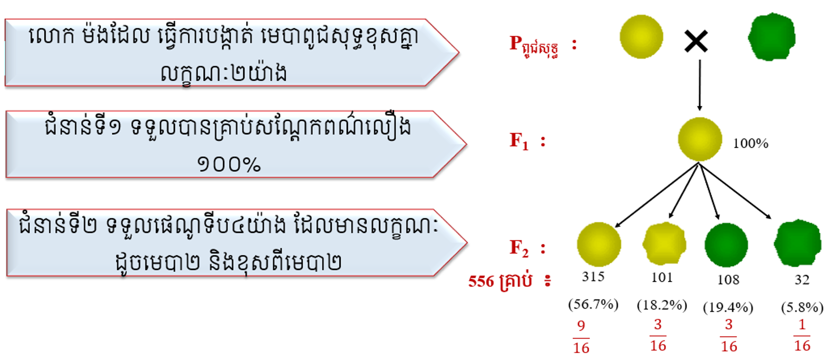 តើហេតុអ្វីបានជានៅជំនាន់ទី២ (F2) មានលេចឡើងនូវផេណូទីបថ្មីផ្សេងពីមេបា? ដោយមេបាជាលក្ខណៈពូជសុទ្ធ ឯកត្តៈ F1 មានលក្ខណៈដូចគ្នាទាំងអស់គឺគ្រាប់រលីងពណ៌លឿងដូចនេះយើងសន្និដ្ឋានថា។ ចំពោះលក្ខណៈសភាពគ្រាប់៖ គ្រាប់រលីង លុបលើ គ្រាប់ជ្រួញ។ ចំពោះលក្ខណៈពណ៌គ្រាប់៖ គ្រាប់ពណ៌លឿង លុបលើគ្រាប់ពណ៌បៃតង។