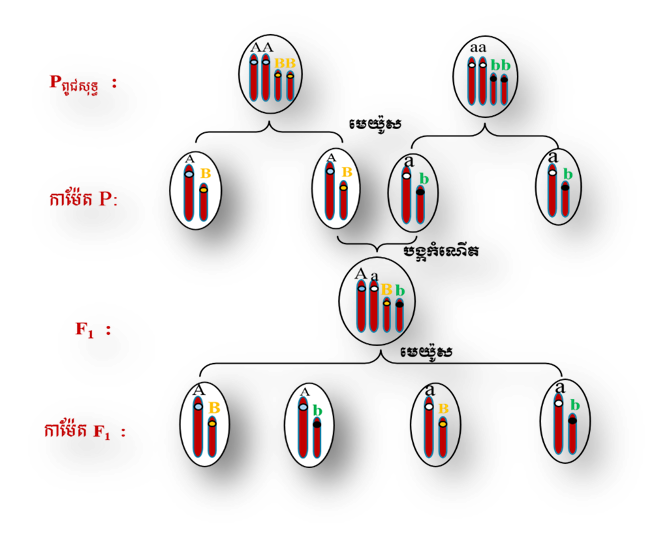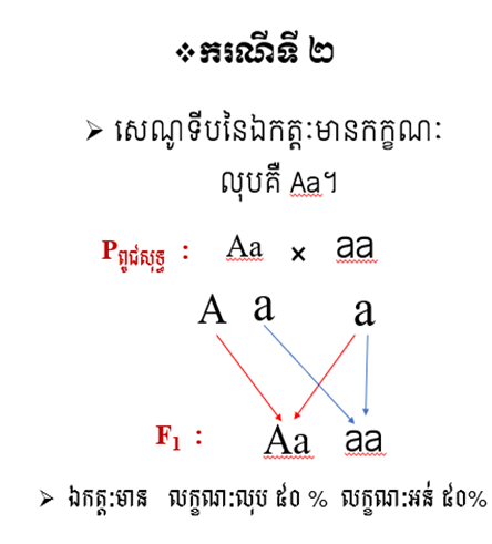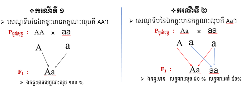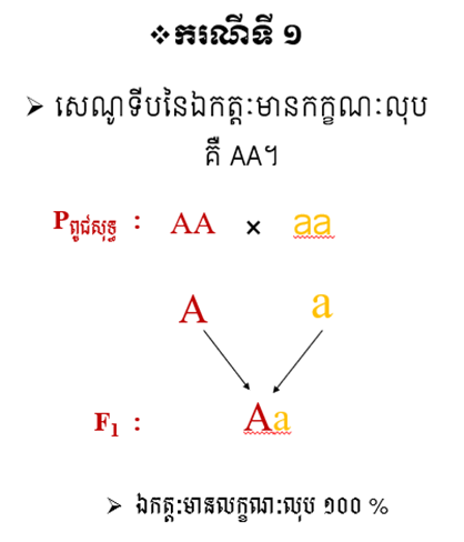 • ករណីជំនាន់ទី១ ជាឯកត្តៈមានលក្ខណៈលុប (អេតេរ៉ូស៊ីកូត) ទាំងអស់ ១០០% ។ បង្ហាញថា៖ សេណូទីបនៃឯកត្តៈមេបាម្ខាងជាលក្ខណៈលុបដែលមានសេណូទីបជាអូម៉ូស៊ីកូត (AA) ។