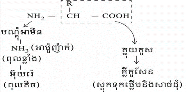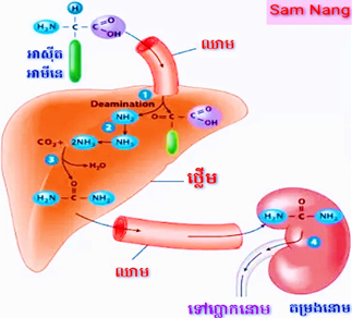 អាស៊ីតអាមីនេជាធាតុបង្កតូចៗរបស់ប្រូតេអ៊ីន។ អាស៊ីតអាមីនេដែលលើសពីតម្រូវការត្រូវទៅក្នុងថ្លើម នៅក្នុងថ្លើម បណ្តុំអាមីនត្រូវផ្តាច់ចេញ ហើយបំប្លែងទៅឧស្ម័នអាម៉ូញ៉ាក់។ បន្ទាប់មកថ្លើមប្លែងឧស្ម័នអាម៉ូញ៉ាក់ និងកាបូនឌីអុកស៊ីតទៅជាអ៊ុយរ៉េ។ ឈាមដឹកនាំអ៊ុយរ៉េពីថ្លើមទៅតម្រង់នោម។