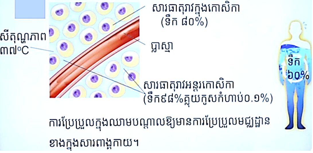 នៅក្នុងប្លាស្មាមានទឹក៩០% និង១០% ជាអំបិល គ្លុយកូស វីតាមីន អាស៊ីតអាមីណេ ប្រូតេអ៊ីន អង់ស៊ីម ហើយស្រទាប់លើនៃអេពីឌែមរបស់ម្រាមដៃ ម្រាមជើង បាតដៃ និងបាតជើងមានស្នាមចង្អូរ និងស្នាមលកពីកំណើតដែលជួយក្នុងការក្តាប់ ឬកាន់។ នៅចុងម្រាមគេហៅថា ស្នាមក្រយៅដៃ ដែលជួយក្នុងការកំណត់លក្ខណៈពិសេសរបស់មនុស្សម្នាក់ៗ។